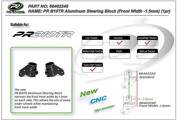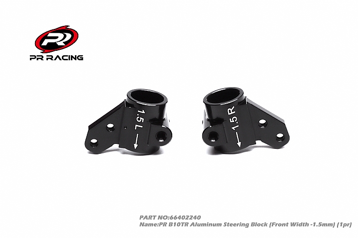 The new PR B10TR Aluminum Steering Block narrows the front track width by 1.5mm on each side. This allows the use of some wider wheels while maintaining front track width.